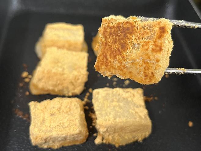 인절미는 전자레인지에 돌리면 떡이 퍼져버릴 수 있기 때문에 팬에서 약불로 천천히 데우는 것을 추천합니다. 팬에 기름 살짝 두르고 가루를 털어낸 인절미를 올려 주세요.