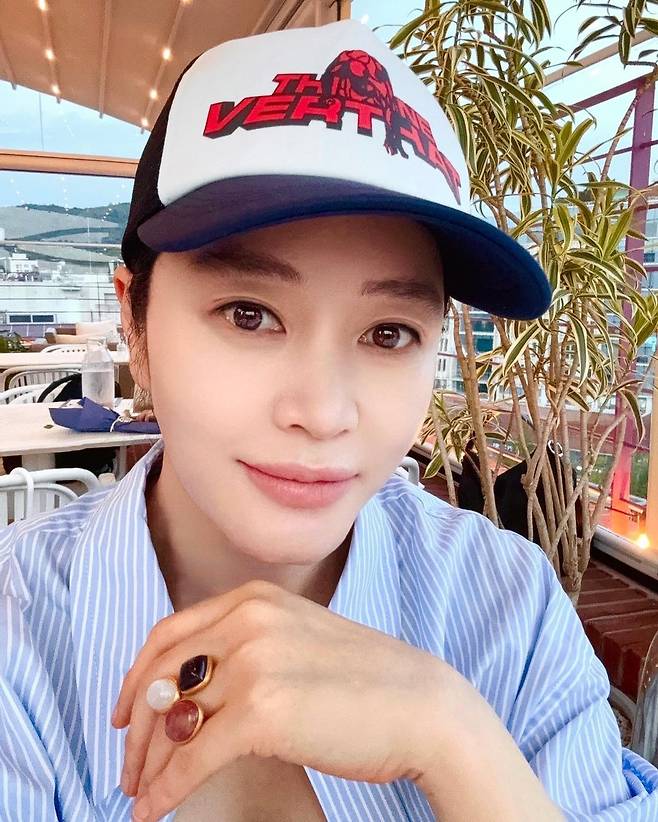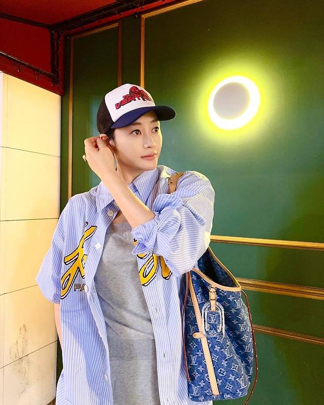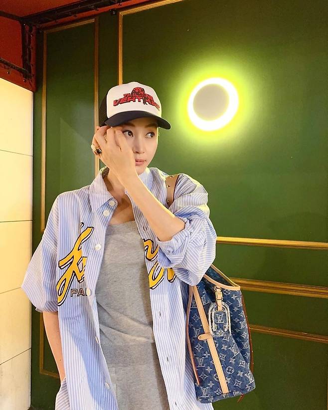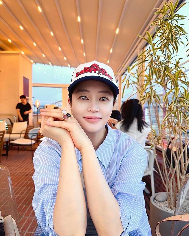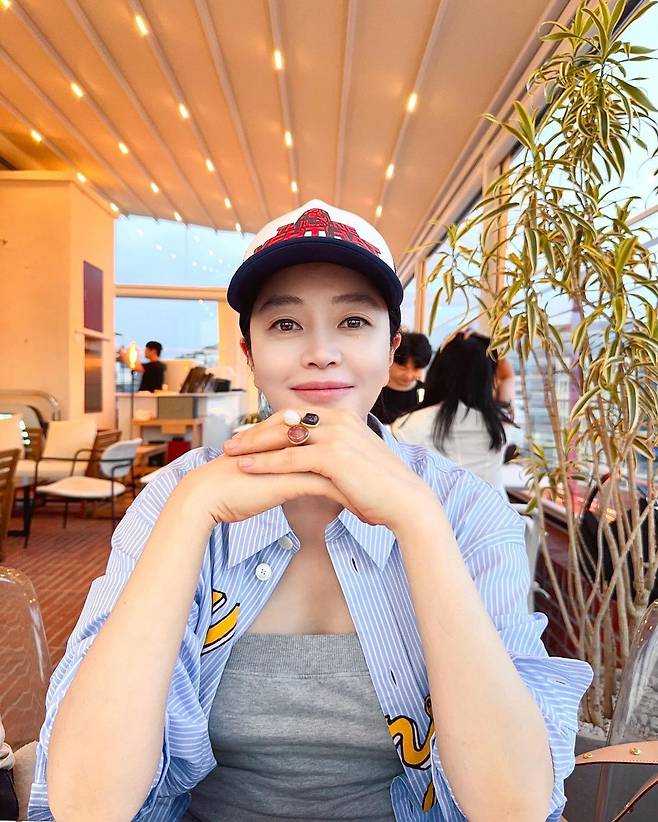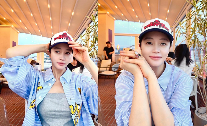 사진 속 김혜수는 그레이 탑을 이너로 입고 하늘색 스트라이프 셔츠를 걸치고 캡모자를 써서 캐주얼한 모습을 선보였다.