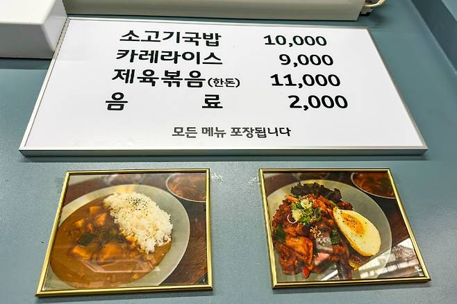 메뉴 : 소고기국밥(10,000원) / 카레라이스(9,000원) / 제육덮밥(11,000원)