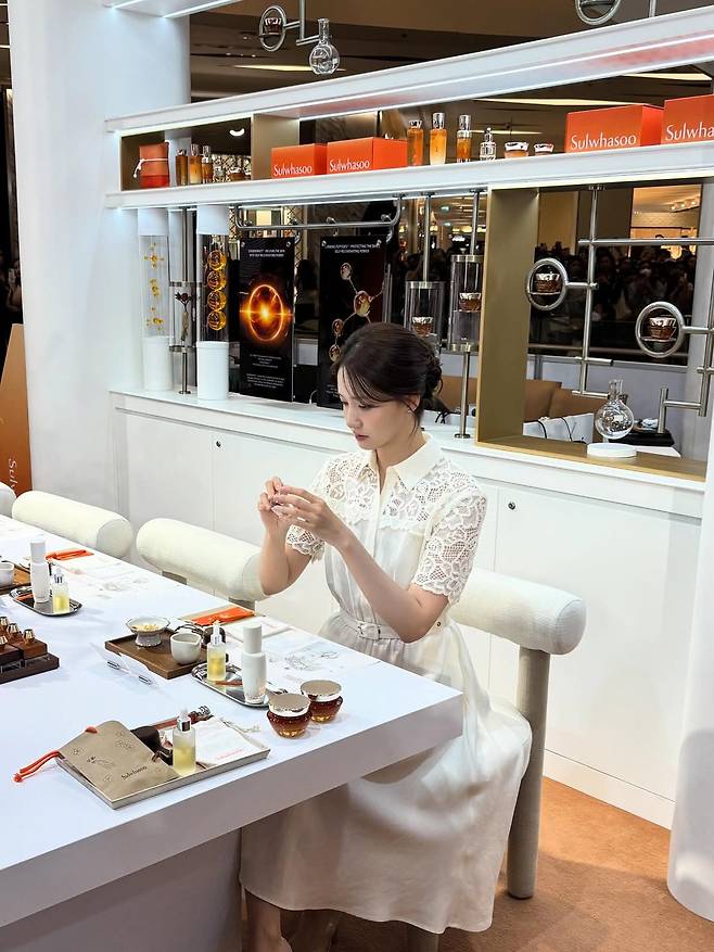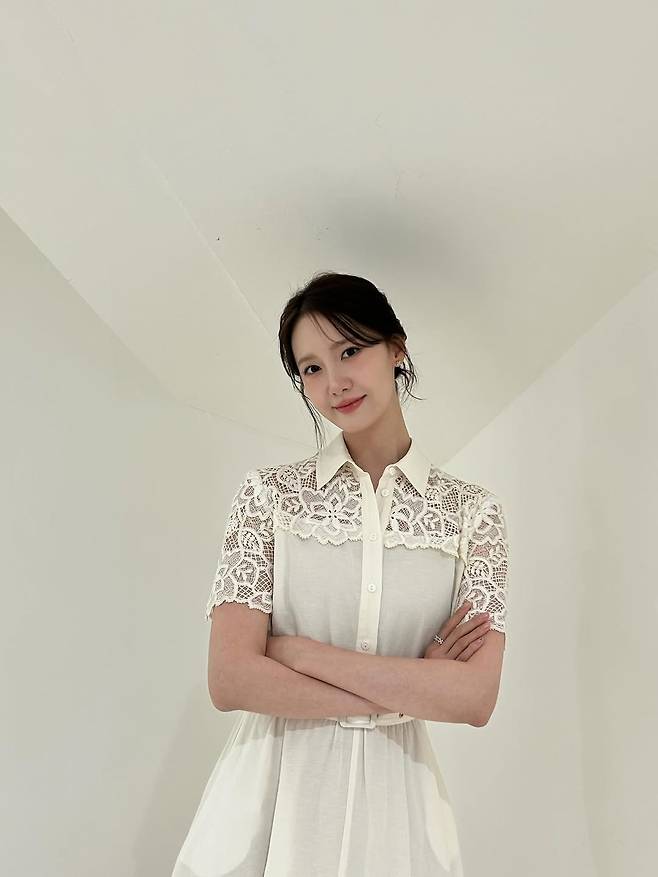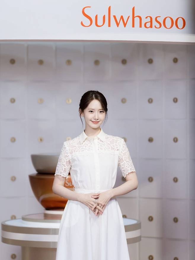 이날 윤아의 선택은 '인간 설화수' 그 자체였다. 그녀는 어깨와 팔 부분에 정교한 레이스 디테일이 더해진 순백의 셔츠 원피스를 선택했다.