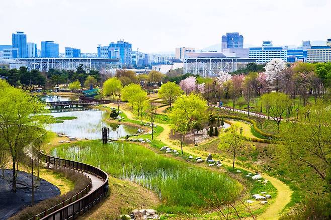 대전시 서구 둔산대로 한복판에 위치한 한밭수목원은 국내 최대 규모의 도심형 인공수목원이다. 원래 엑스포 과학공원 부지였던 이곳은 2001년 개장 이후 동원과 서원, 그리고 열대식물원이 순차적으로 조성되며 지금의 모습으로 자리 잡았다.