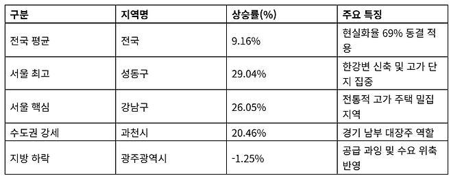 이번 발표에서 가장 눈에 띄는 지역은 성동구입니다. 성동구의 공시가격 상승률은 29.04%로 전국 최고치를 경신했습니다. 강남 3구(강남 26.05%, 서초 23.32%, 송파 25.49%)보다도 높은 수치입니다. 이는 마용성(마포·용산·성동)으로 대표되는 한강 벨트의 신축 아파트 선호 현상이 공시가격에 강력하게 반영되었음을 의미합니다. 반면 대구(-0.76%)나 광주(-1.25%) 등 지방 광역시는 하락세를 면치 못하며 수도권과 지방 간의 자산 양극화가 더욱 심화되는 양상입니다.