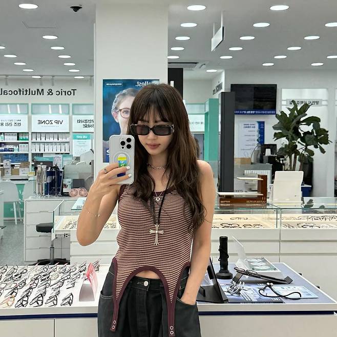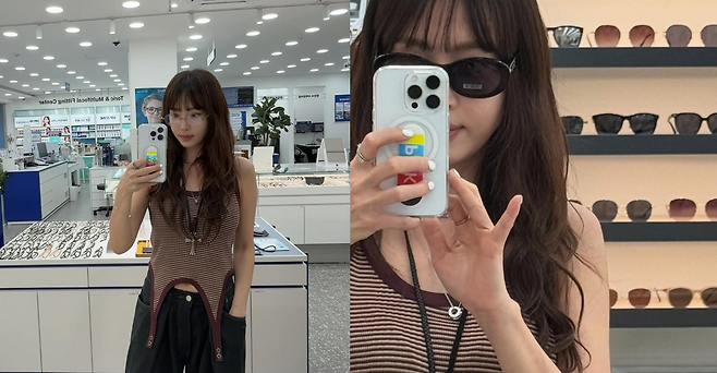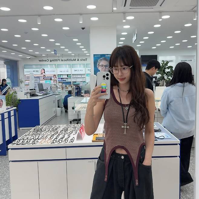 진열장마다 빼곡히 놓인 안경테 사이, 줄무늬 슬리브리스와 루즈한 블랙 팬츠를 입고 카메라 앞에 선 그녀의 모습은 자연스러우면서도 스타일리시하다.