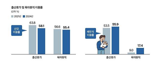 응답자 3221명 가운데 출산 직전 취업상태였던 산모는 82.0%로 이들 중 출산휴가 또는 육아휴직을 사용한 사람은 각각 58.1%, 55.4%로 집계됐습니다. 2021년 조사 때와 비교하면 5.7%포인트(P), 1.2%P 떨어진 수치입니다. 반면에 배우자 출산휴가·육아휴직 이용률은 각각 2.4%P, 8.4%P 오른 55.9%, 17.4%로 나타났습니다.