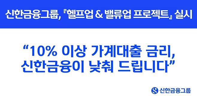 [엠투데이 이정근기자] 신한금융그룹은 이달 중 신한은행 가계대출 보유 고객의 금융부담 완화를 위해 금리가 두 자릿수 이상인 모든 기존 가계대출의 금리를 한 자릿수로 인하하고, 서민 신용대출 신규 시 금리를 조건 없이 1%p 인하하는 『헬프업 & 밸류업(Help-up & Value-up) 프로젝트』를 시행한다고 2일 밝혔다.
