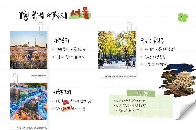오늘은 전국을 대표하는 6개 지역 서울부터 제주까지, 11월 국내 여행지 추천 리스트를 소개합니다.