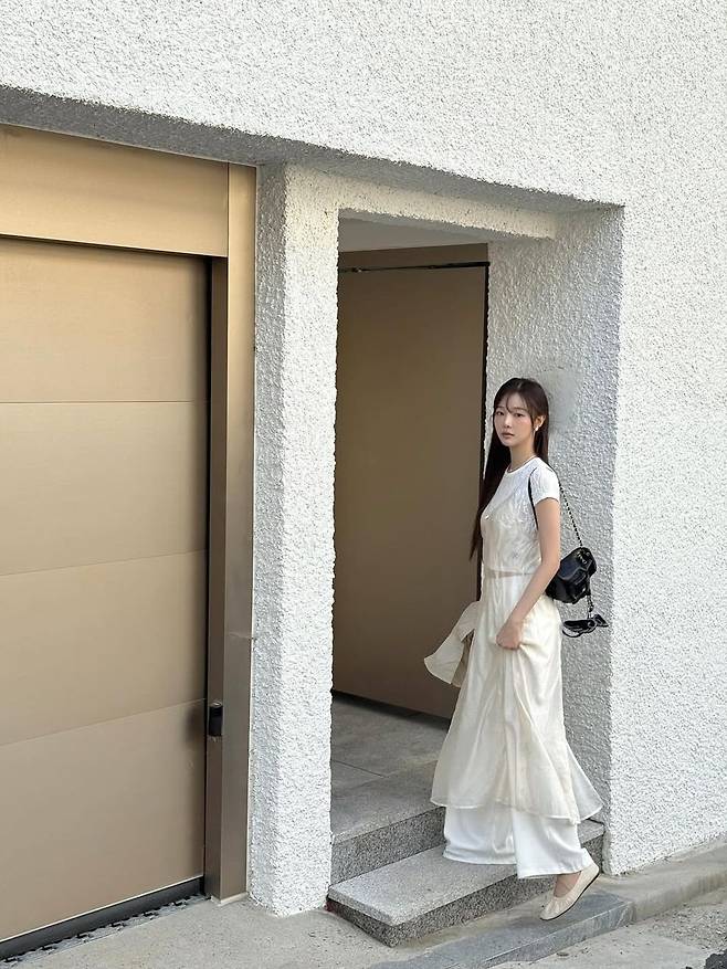 이 룩의 핵심은 '톤온톤 + 시스루 레이어드'에 있다. 따라 하고 싶다면, 화이트 이너와 얇은 시스루 원피스를 겹쳐 입고, 액세서리는 심플한 실버 계열로 통일감을 주는 것이 팁이다. 가방은 미니멀한 디자인으로, 컬러는 대비를 주는 것이 스타일을 살릴 수 있다.