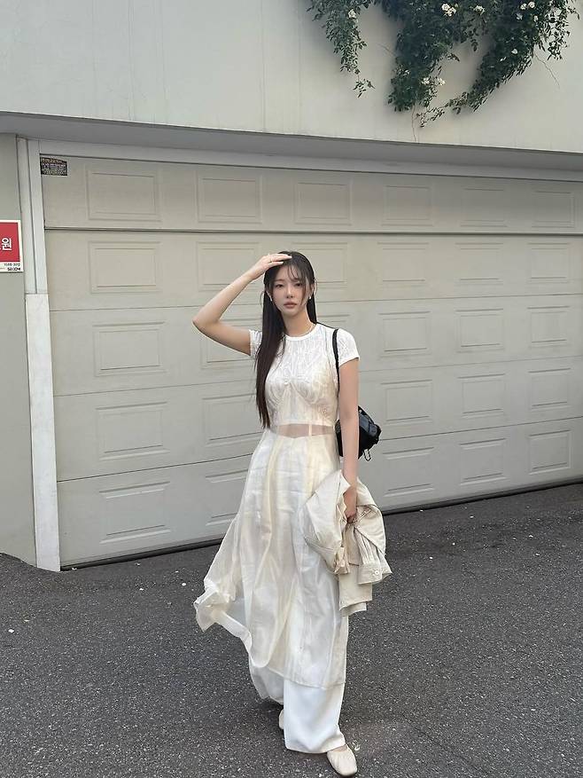 이날 이시안은 화이트 톤의 시어 셋업을 중심으로 한 투명 레이어드 스타일링을 선보였다. 기본 화이트 티셔츠 위에 시스루한 뷔스티에 원피스를 겹쳐 입어 시각적인 깊이를 더했고, 전체적으로 실루엣은 슬림하게 떨어져 바디라인을 우아하게 강조한다. 원단 특유의 광택감이 햇살을 머금어 은은하게 반짝이며, 그녀의 투명한 피부톤과도 찰떡같은 조화를 이룬다.