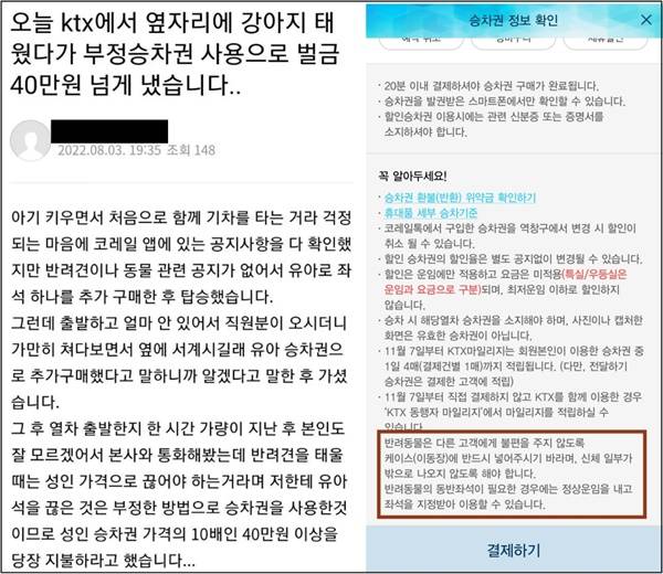 글쓴이는 반려동물과 KTX를 이용하려고 코레일 앱에 들어갔지만 관련 공지사항이 없어 유아로 좌석 하나를 추가 구매한 후 탑승했다. 하지만 탑승 후 직원에게 '반려견을 태울 때는 성인 가격으로 구매해야 한다'는 이야기를 들었고, 부정 승차권을 사용했으니 정상 운임의 10배인 40만 원을 지불하라는 말을 들었다고 밝혔다.