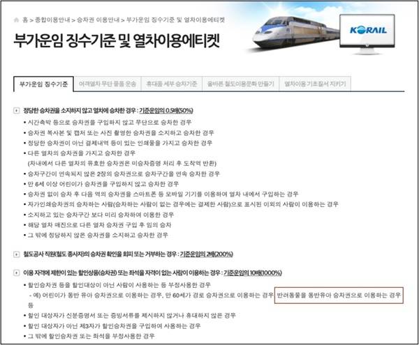 | ▲ 코레일 홈페이지에는 반려동물을 동반유아 승차권으로 이용하는 경우 기준 운임의 10배를 징수한다고 명시했다. |