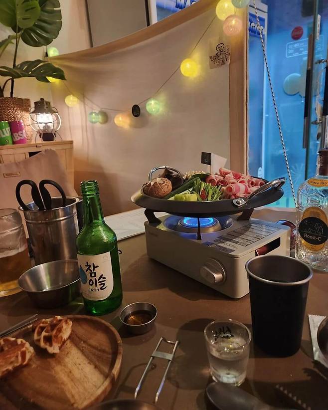 이곳에서는 기본 안주로 제공되는 크로플을 직접 구워 먹을 수 있어, 캠핑 분위기를 물씬 느낄 수 있다.