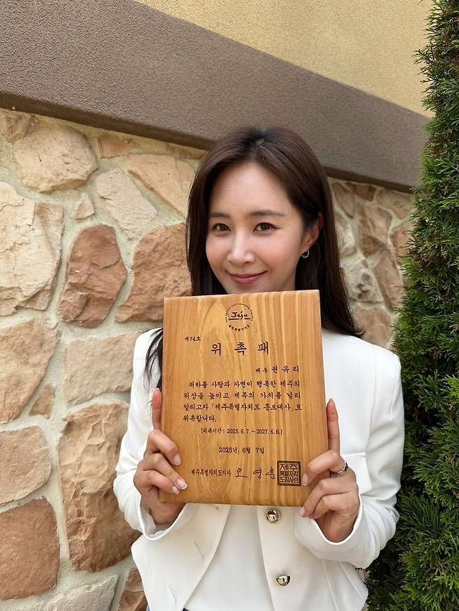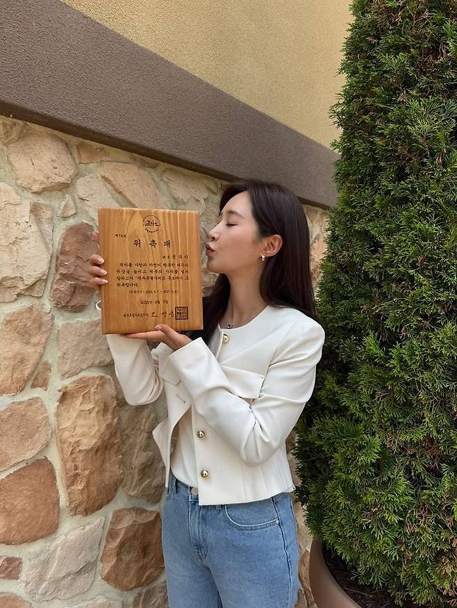 권유리가 한 손엔 감사패를 들고 밝은 미소를 띤 채 찍은 사진이 팬들의 관심을 모으고 있다. 자연광 아래 벽돌 배경과 푸르른 나무가 어우러진 장소에서, 그녀는 청량한 포멀룩을 선보이며 존재감을 드러냈다.