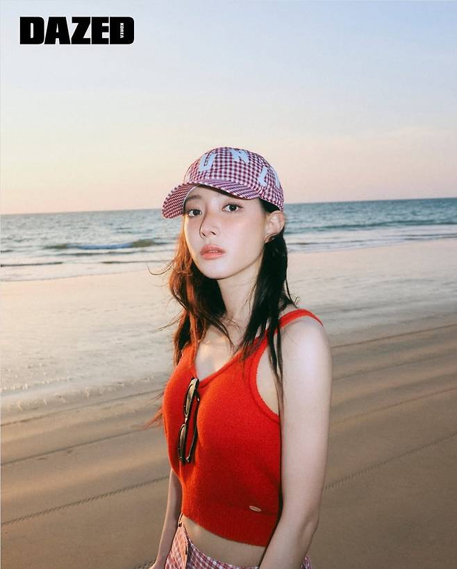 이세영은 붉은 니트 슬리브리스와 깅엄 체크 캡으로 바다를 배경으로 한 청량한 스타일을 연출했습니다.