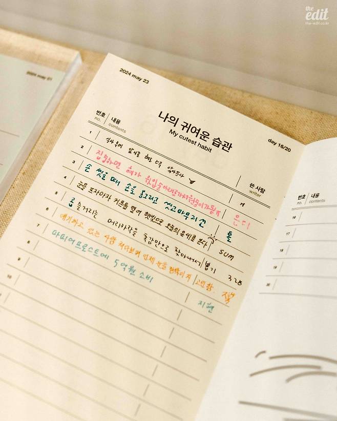 쓰는 사람들이 느슨하게 연결될 수 있는 커뮤니티의 역할도 한다. ‘릴레이 레코드북’ 코너가 마련되어 있는데, 매일 달라지는 주제에 대해 자유롭게 기록을 남길 수 있다. 글을 써도 되고, 그림을 그려도 좋다. 주제는 ‘생각만 해도 달콤한 언어’, ‘나의 귀여운 습관’, 내가 가장 듣고 싶었던 말은?’ 등등. 기록을 통해 다른 사람들의 생각을 엿보는 재미가 있다.