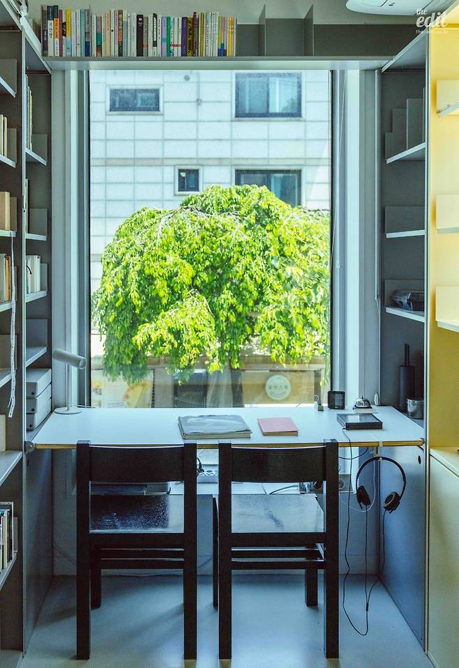 미리 네이버로 예약하고 정해진 시간에 방문하면 된다. 1시간이나 2시간 중 선택해 예약할 수 있는데, 나는 촬영 시간을 감안해 2시간을 예약했다. 사장님의 안내에 따라 2층으로 올라오면 나를 위한 1인용 공간을 만날 수 있다. 가장 매력적인 건 정면의 통창 너머로 보이는 커다란 나무. 바람이 불면 싱그럽게 잎을 흔드는 모습을 볼 수 있다.