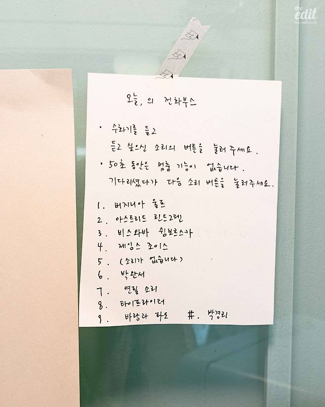 마지막으로 공중전화 부스가 눈에 띈다. ‘오늘의 전화부스’에서는 듣고 싶은 작가의 목소리를 들을 수 있다. 버지니아 울프, 박완서 등 원하는 작가의 번호를 누르면 50초 동안 수화기 너머로 목소리가 흘러나온다. 이외에도 북클럽, 낭독회, 글쓰기 워크숍 등 다양한 오프라인 이벤트가 열리니 관심 있는 사람은 인스타그램에 업로드되는 공지를 눈여겨보자.