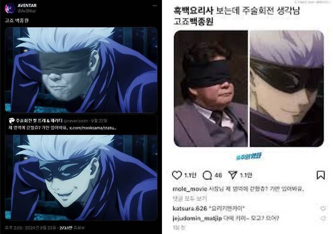 패러디되고 있는 캐릭터는 일본의 인기 애니메이션 '주술회전' 속 등장하는 캐릭터로 안대를 쓰고 음식을 먹는 백종원의 모습이 화제가 되면서 늘 눈을 가리고 있는 고죠사토루 캐릭터가 소환된 것입니다.