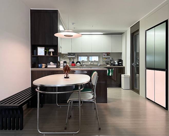 다음으로 주방을 소개해 드릴게요. 이곳은 별도의 시공 없이 원형 그대로 사용하고 있습니다. 특별히 인테리어를 하기보다는 최대한 상판에 물건을 두지 않는 게 예쁘다고 생각해서, 항상 깔끔한 상태를 유지하려고 해요. 대신 다이닝 공간의 조명을 '스마트 전구'로 교체해서 필요에 따라 조도, 색온도를 조절하고 있습니다.