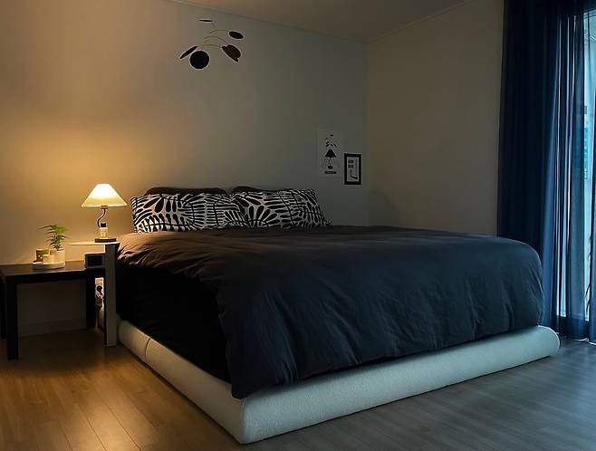침실은 '함께 남은 대화를 나누다가 자연스레 잠들 수 있는 공간'을 컨셉으로 꾸몄어요. 하루의 마무리이자 시작점인 공간인 만큼 최대한 안락하고 포근한 공간이 되길 바랐거든요. 가장 큰 면적을 차지하는 침대는 라지 킹사이즈예요. 프레임을 무헤드 제품으로 선택해서 답답하지 않도록 연출했습니다.