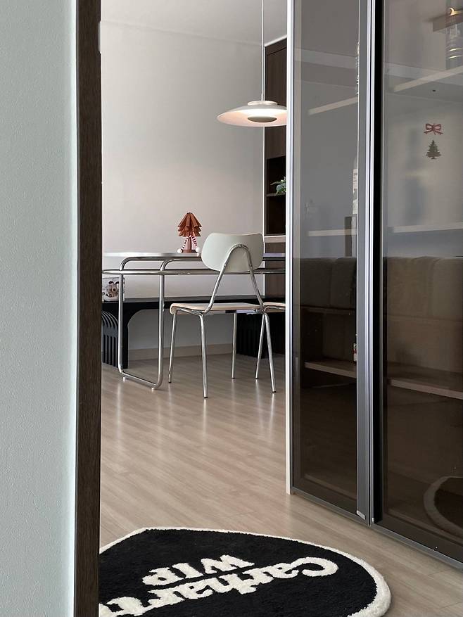 다이닝 테이블과 의자는 모두 금속 느낌이 나는 제품으로 선택했어요. 신혼집 인테리어에 전체적으로 알루미늄과 철재 소재가 많아서 통일감을 주려고 했습니다.