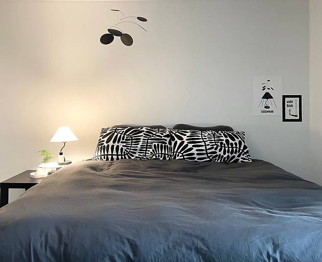 침실의 메인 컬러는 블랙입니다. 다만 전체적으로 색은 통일하되, 소재나 어두운 정도를 달리하여 단조롭지 않도록 노력했어요. 여기에 조명을 더해 따뜻한 분위기를 연출해 주었습니다.