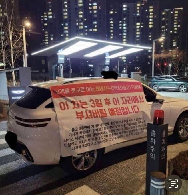아이디 ‘걸인28호’는 게시판에 “고객을 호구로 아는 제네시스(현대자동차) 덕분에 이 차는 3일 후 이 자리에서 부숴버릴 예정입니다”라는 글과 사진을 게시했다.