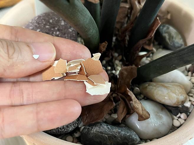 계란 껍데기를 절구에 갈거나 혹은 봉지 안에 넣고 두드려서 잘게 조각냅니다.
