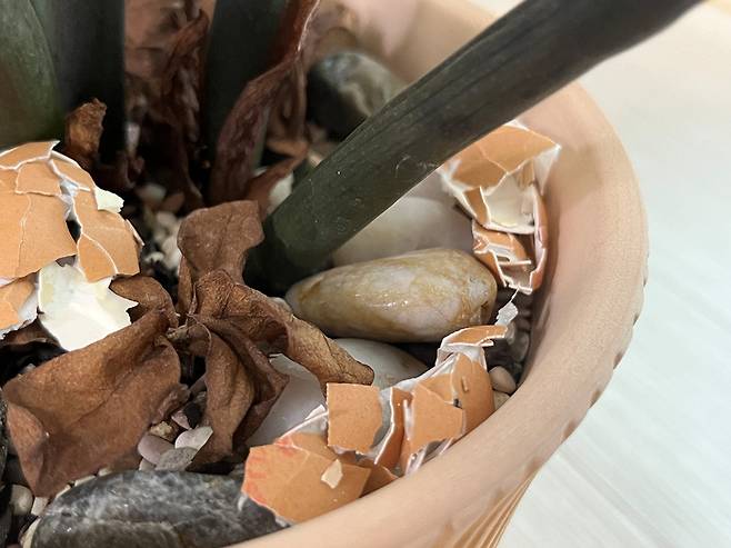 계란 껍데기로 만든 퇴비는 화분 위에 뿌립니다. 계란 껍데기를 통째로 올려 두는 것보다 잘게 조각을 내어 뿌리면 흙에 영양분 흡수가 더 잘 된다고 합니다.