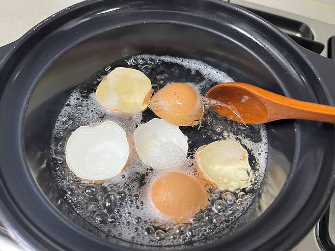 씻어서 말린 계란 껍데기를 끓는 물에 한번 데칩니다.