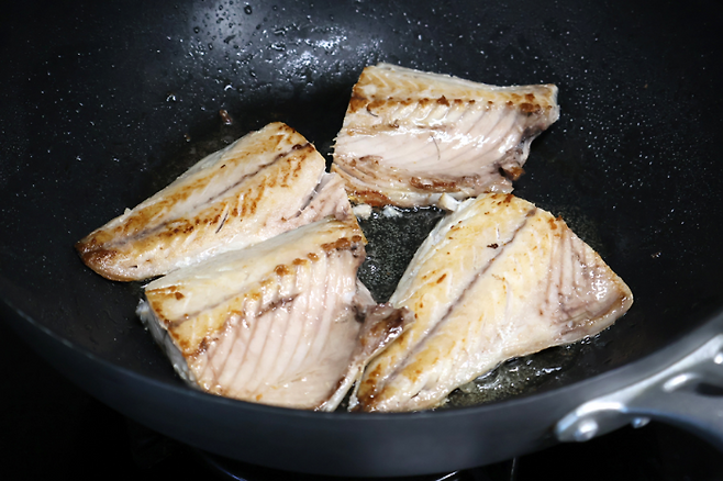 후라이팬에 기름을 넉넉하게 두르고 껍질 있는 쪽부터 구워줍니다. 한 번 기름에 튀기듯 구워서 졸이면 살이 부서지지 않고 쫄깃해서 더 맛있어요.