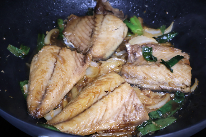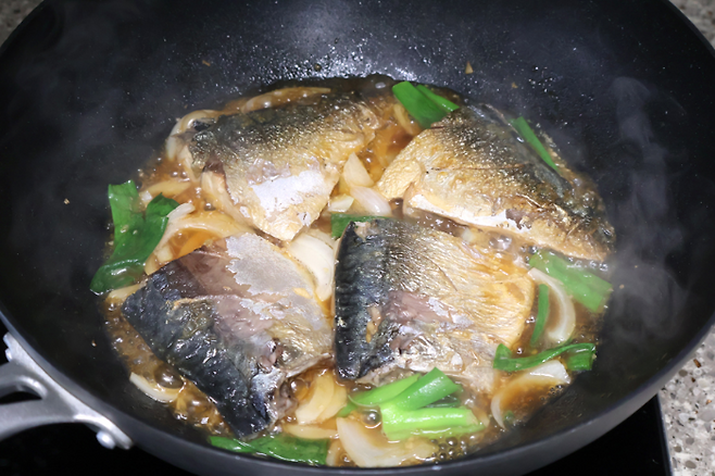 팬에 다시 고등어를 넣고 양념을 모두 부은 뒤 물 150ml 부어서 끓여요. 강불에서 팔팔 끓기 시작하면 약불로 줄이고 은근하게 졸이면 됩니다.