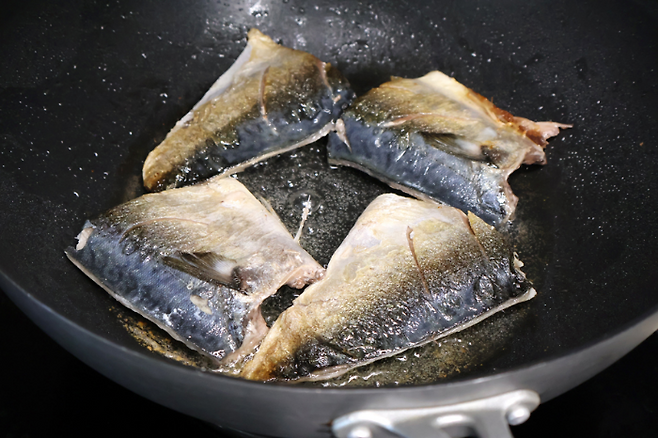 다 구워지면 고등어는 잠시 덜어두고 후라이팬에 남은 기름을 키친타올로 닦아내요.