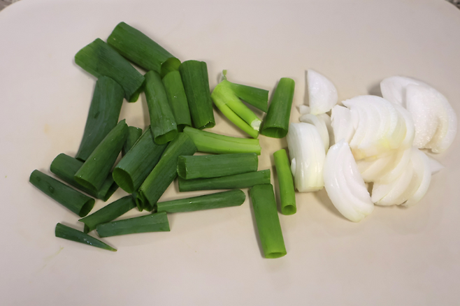 양파 1/2개, 대파 1대 씻어서 큼직하게 썰고요.