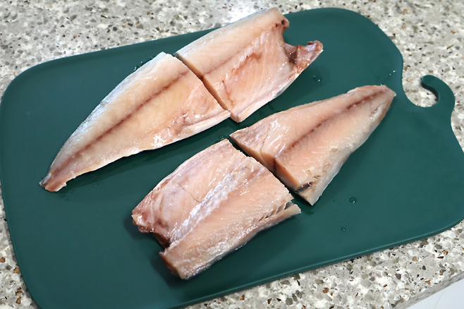 냉동고등어 2팩을 꺼냈어요. 1마리 분량인데요~ 살짝 해동 시켜서 반으로 잘랐습니다.