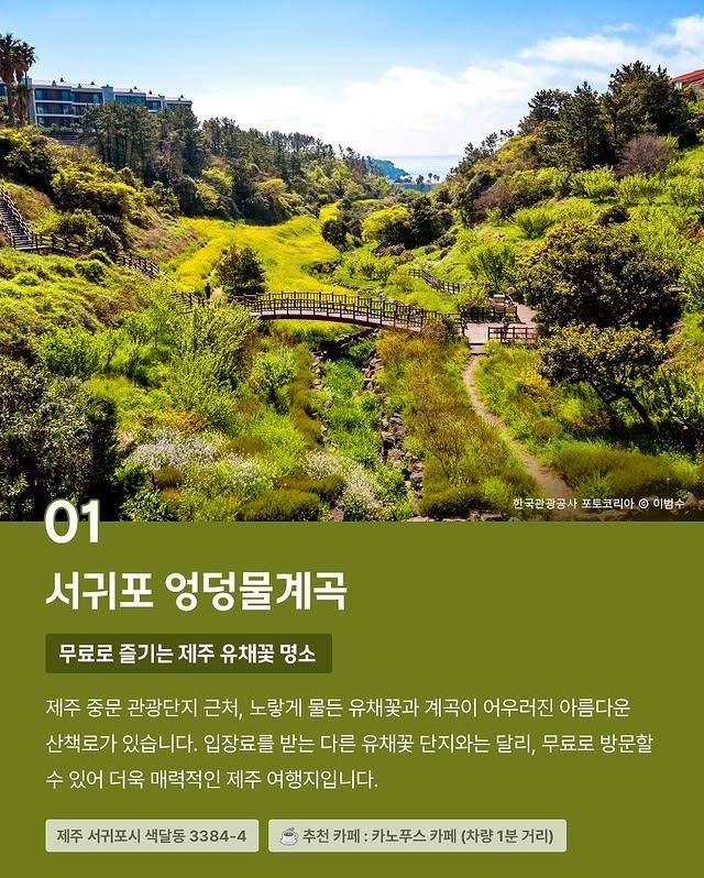 제주 중문 관광단지 근처, 노랗게 물든 유채꽃과 계곡이 어우러진 아름다운 산책로가 있습니다.