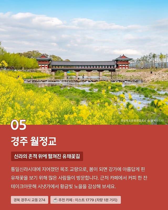통일신라시대에 지어졌던 목조 교량으로, 봄이 되면 강가에 아름답게 핀 유채꽃을 보기 위해 많은 사람들이 방문합니다.