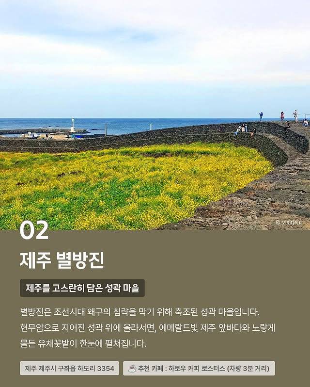 현무암으로 지어진 성곽 위에 올라서면, 에메랄드빛 제주 앞바다와 노랗게 물든 유채꽃밭이 한눈에 펼쳐집니다.