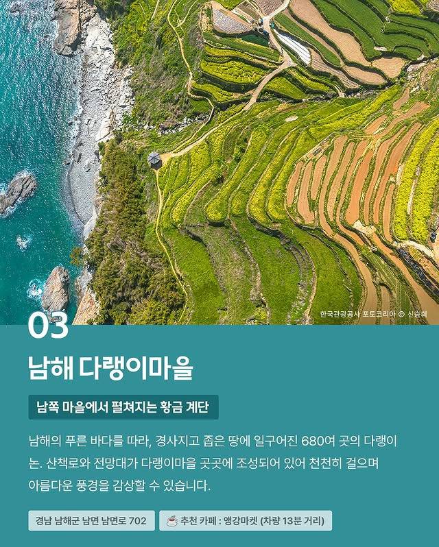남해의 푸른 바다를 따라, 경사지고 좁은 땅에 일구어진 680여 곳의 다랭이 논, 산책로와 전망대가 다랭이마을 곳곳에 조성되어 있어 천천히 걸으며 아름다운 풍경을 감상할 수 있습니다.