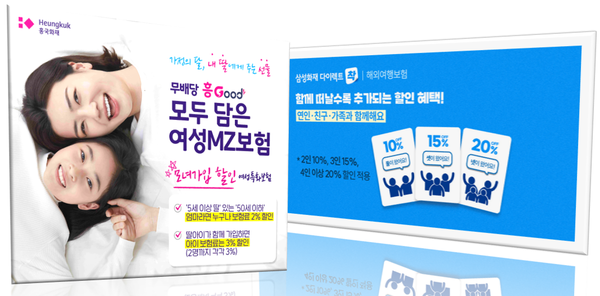 흥국화재는 '흥Good 모두 담은 여성MZ보험'을 통해 모녀가입 할인을 선보였다. 5세 이상 딸을 둔 50세 이하 엄마라면 누구나 월 보험료의 2%를 할인해준다. 딸 아이도 같이 가입한다면 아이의 보험료는 3% 할인된다. 딸이 두 명인 경우 각각 3%씩 할인한다.