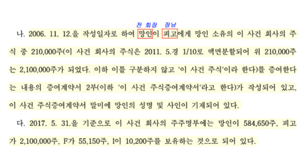 이러한 사정을 종합한 재판부는 "이 사건 주식은 전 회장에게 반환돼야 할 것"이라며 "전 회장은 유언공증을 통해 이 사건 주식에 대한 권리를 차남에게 증여했으며, 주식의 소유자는 차남"이라고 했다. 지난 2022년 1월 재판부는 전 회장 승소로 판결했다.