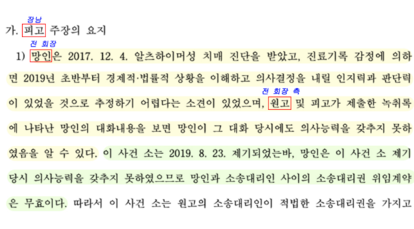재판에서 장남은 전 회장이 지난 2017년 알츠하이머성 치매 진단을 받았고, 진료기록 감정 등에 따르면 소송 제기 당시 의사능력을 갖추지 못한 상태였다고 주장했다. 이에 따라 전 회장과 A씨 간 소송대리권 위임계약은 무효라고 했다. 장남은 유언공정증서 역시 전 회장의 진정한 의사에 따라 작성된 것으로 볼 수 없고, 기명날인이 없어 무효라고 주장했다.