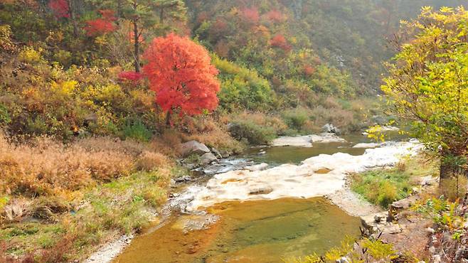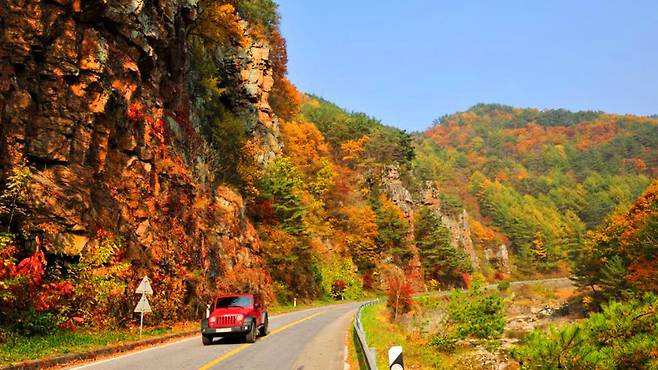 지방도 421호선을 따라 이어지는 소금강변 드라이브 코스는 가을에 더욱 빛납니다. 도로 양옆으로는 붉게 물든 숲과 하얀 절벽이 어우러져, 마치 동화 같은 장면을 연출합니다.