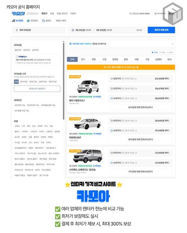 제주 렌터카 가격비교 사이트 ‘카모아’는 제주를 포함한 전국 렌터카 업체 가격 비교와 함께 최저가 보장 서비스를 운영합니다. 결제 후라도 더 저렴한 가격이 있다면 보상해주는 제도가 있어 합리적인 소비자들에게 큰 인기를 얻고 있습니다.