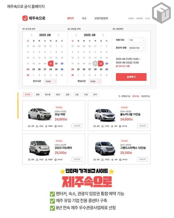 제주 렌터카 업체 ‘돌하루팡’은 여러 렌트카 업체를 한눈에 비교할 수 있어, 합리적인 선택이 가능합니다. 사용자 중심의 플랫폼 구조 덕분에 제주 지역 내 재이용률 1위를 자랑합니다.