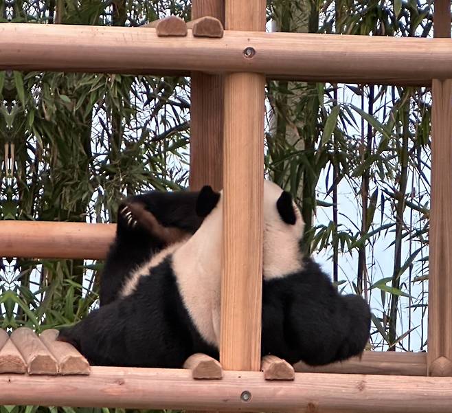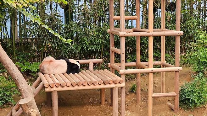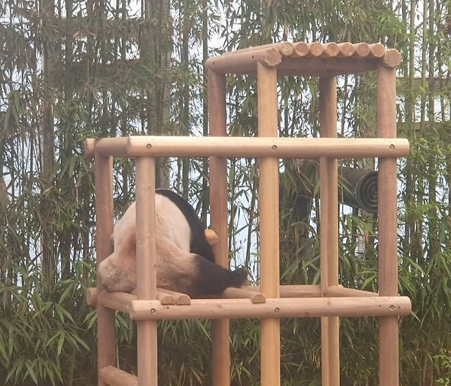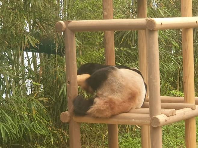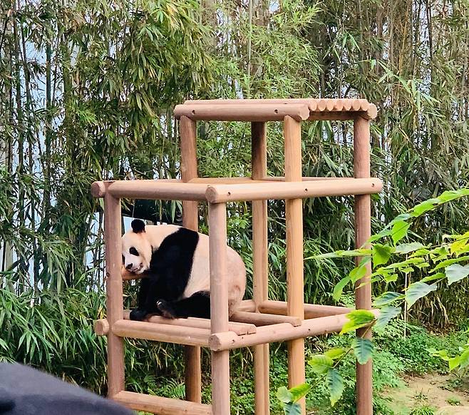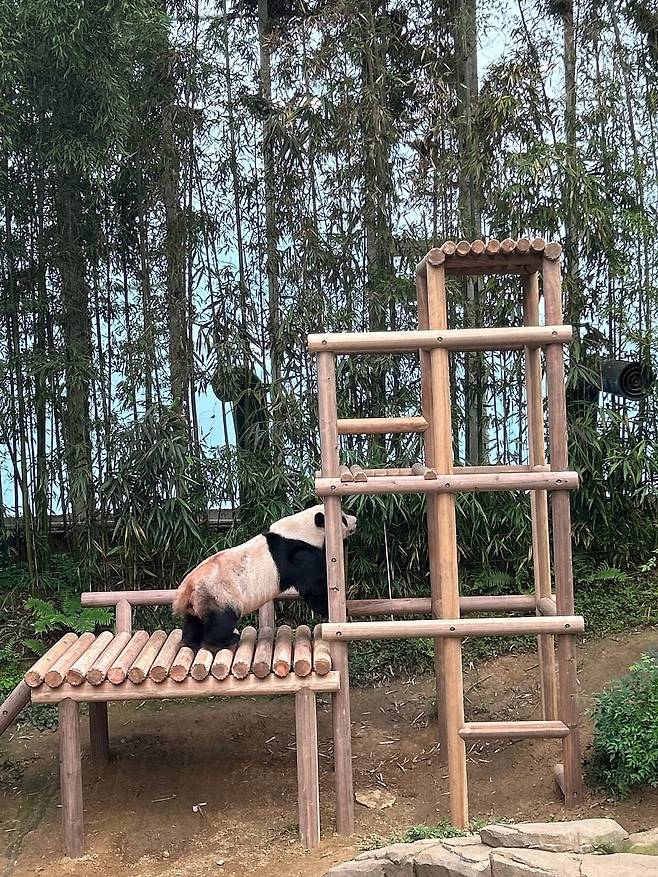 우려와 달리 러바오는 금세 적응하는 모습을 보였습니다. 이리저리 살펴보더니 다시 새 방법을 찾은 러바오. 마치 "좋아하던 자리가 이제 통풍까지 잘 되네?😋" 라는 듯한 자연스러움이었습니다.