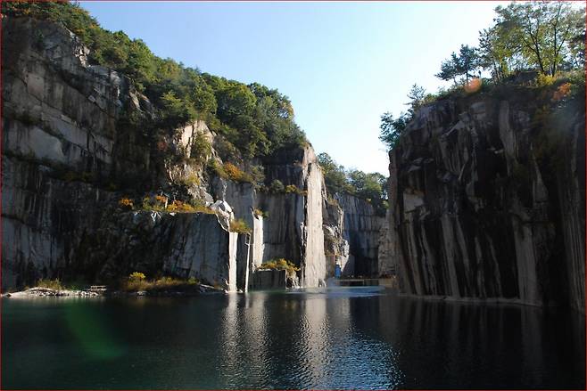 천주호의 탄생: 화강암을 파냈던 거대한 웅덩이에 빗물과 샘물이 고이며 수심 20m의 에메랄드빛 호수가 되었습니다. 가재와 도롱뇽이 사는 1 급수로 정화하는 데 막대한 비용과 노력이 들어갔죠.