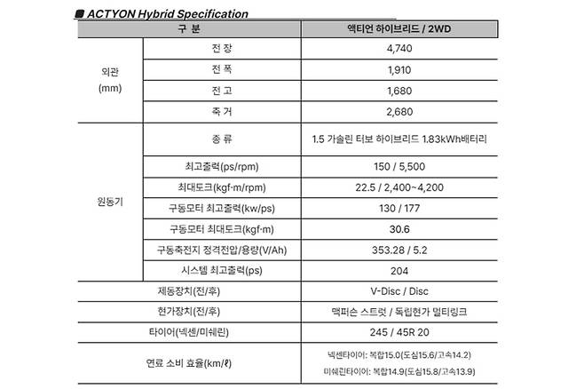 또한 국내 하이브리드 모델 중 가장 큰 1.83kWh 고전압 배터리가 적용됐다. 130kW급 대용량 모터로 전기차에 가까운 다이내믹한 주행 성능이 구현됐다. 액티언 하이브리드 복합연비는 20인치 휠 기준 15km/ℓ, 미쉐린 타이어 선택시 도심 연비는 15.8km/ℓ다.
