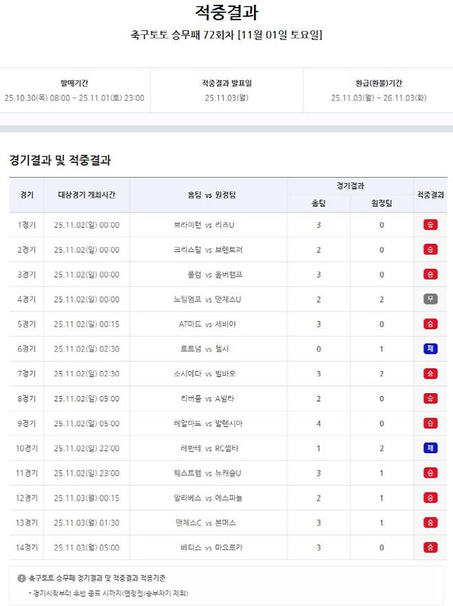 서울올림픽기념국민체육진흥공단(이사장 하형주)이 발행하는 체육진흥투표권 스포츠토토의 수탁사업자 한국스포츠레저㈜가 공식 인터넷 발매 사이트 '베트맨'을 통해 지난 11월 2일부터 3일까지 진행된 영국 프리미어리그(EPL) 및 스페인 프리메라리가(라리가) 14경기를 대상으로 실시한 축구토토 승무패 72회차의 적중결과를 발표했다.