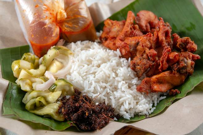 코코넛 밀크와 판단 잎으로 조리한 밥에 매콤한 삼발소스, 땅콩, 튀긴 멸치, 삶은 계란을 함께 곁들여 먹습니다. 우리나라로 치면 백반에 가까운 요리로 모든 사람들이 즐겨먹는 음식입니다.