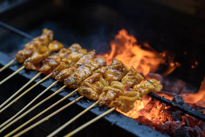 시원한 맥주와 절묘하게 어울리는 꼬치 요리, 바로 그것이 사테입니다. 소고기, 돼지고기, 닭고기, 새우와 같은 다양한 육류를 맛깔스럽게 양념하여 숯불에서 바삭하게 구웁니다. 그 후, 그 육류를 고소한 땅콩 소스에 푹 찍어 먹는 방식으로 즐깁니다.